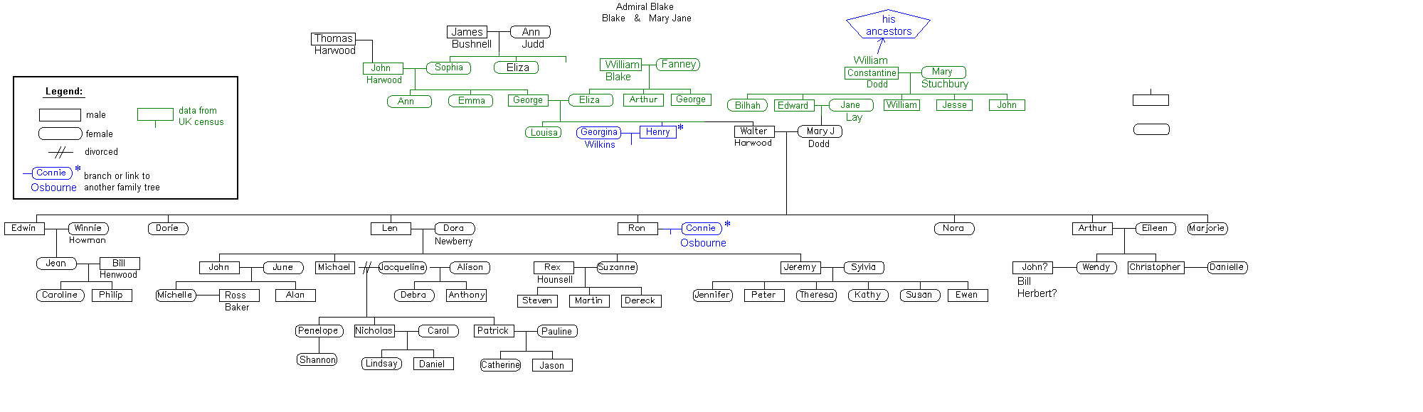 W Constantine Dodd's acnestors to Osbourne family tree to Harry Harwood family tree